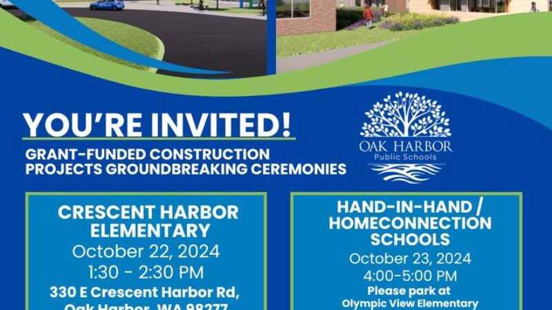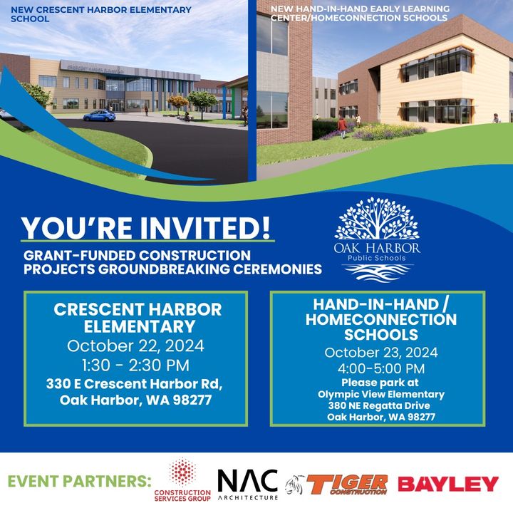 The Crescent Harbor Elementary groundbreaking will be next Tuesday, October 22 at 1:30 PM and the Hand-in-Hand/HomeConnection ceremony will be on Wednesday, October 23 at 4 PM at the new school site. We hope our #OneOakHarbor community will join us in marking this important milestone for our schools! 🎉