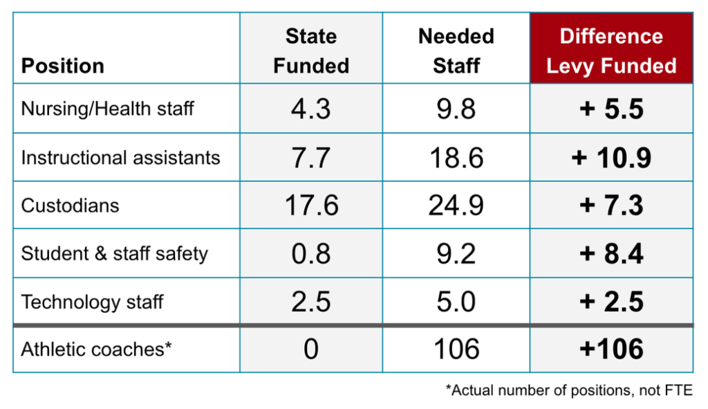 Below are specific examples of some of the funding gaps we currently use the existing levy dollars to help fill. (Measured in full-time equivalent, or FTE, except for coaches.)
