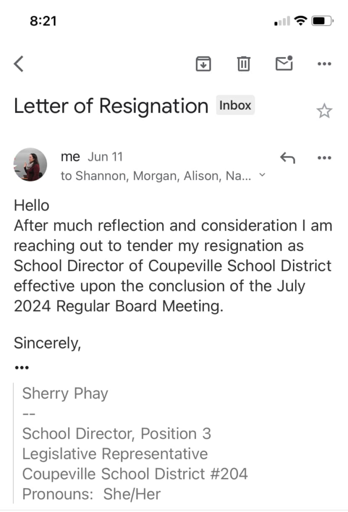 Coupeville School District Director Sherry Phay posted on her Facebook page on Tue., June 18, 2024 about her resignation from the school board.