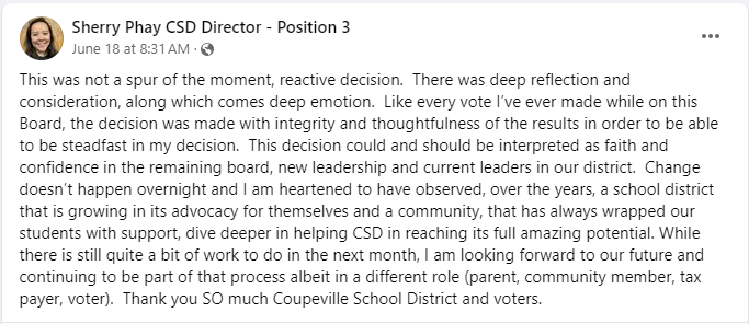 Coupeville School District Director Sherry Phay posted on her Facebook page on Tue., June 18, 2024 about her resignation from the school board.