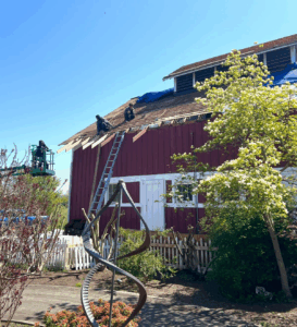 Roof repair work is underway now on two Greenbank Farm barns. The new roof is wood shingles, in compliance with historic preservation guidelines.