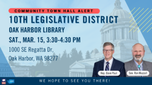 Sen. Ron Muzzall, R-Oak Harbor and Rep. Dave Paul, D-Oak Harbor invite residents of the 10th Legislative District to attend a joint, bipartisan in-person town hall meeting on Saturday, March 15, from 3:30 to 4:30 p.m. at the Oak Harbor Library, located at 1000 SE Regatta Dr., Oak Harbor, WA 98277.