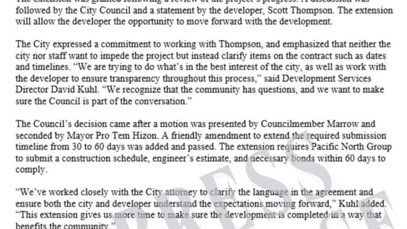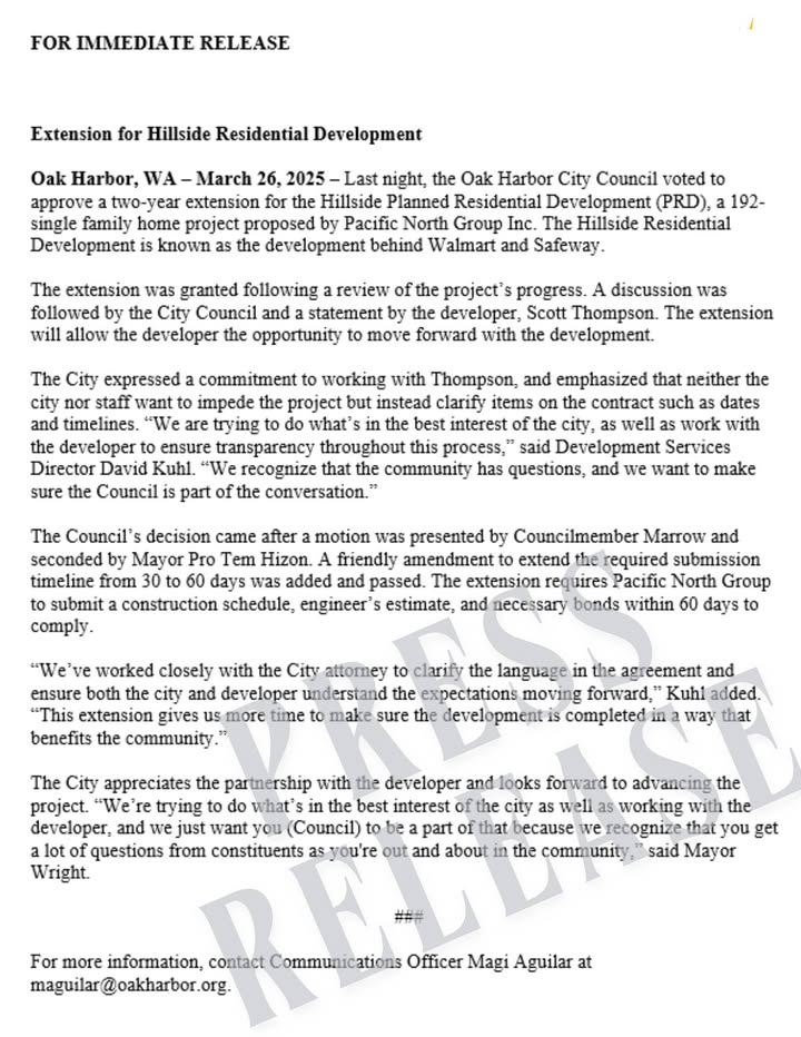 Cities / Curated OAK HARBOR: Extension for Hillside Residential Development (FB) FOR IMMEDIATE RELEASE Extension for Hillside Residential Development (known as the development behind Walmart and Safeway) March 27, 2025