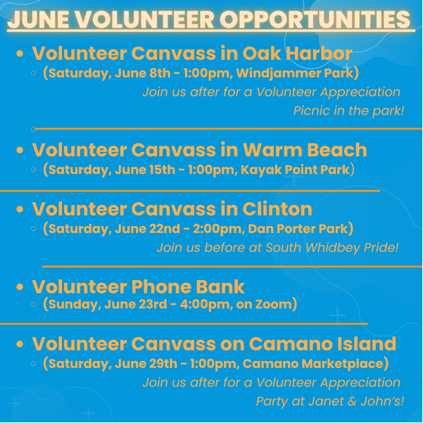 Our canvassing work is the single biggest reason we flipped the seat in 2018, and our outreach efforts will be pivotal to our victory in November. I am actively seeking volunteers to help with my campaign starting now in all areas, especially Oak Harbor, Camano Island, Stanwood, and Arlington.