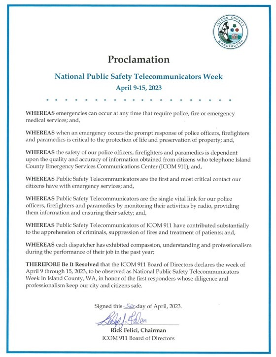 THEREFORE, Be It Resolved that the ICOM 911 Board of Directors declares the week of April 9 through 15, 2023, to be observed as National Public Safety Telecommunicators Week in Island County, WA, in honor of the first responders whose diligence and professionalism keep our city and citizen safe.