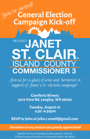 PS If you live on Camano, we have upcoming events scheduled for Camano. Stay tuned on the website at www.janetstclair.com or our Facebook page Committee to Elect Janet St Clair | Facebook.