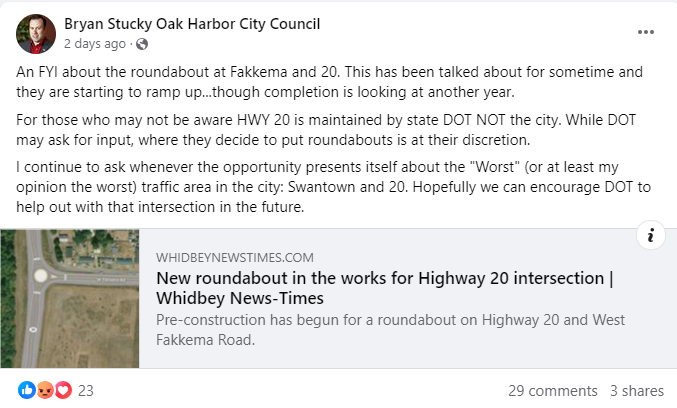 Oak Harbor City Councilor Bryan Stucky posted on his Facebook page about a story in the Whidbey News-Times on a roundabout that is under construction north of Oak Harbor.