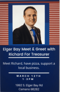 Hello, we hope you can come to Richard For Treasurer meet & greet at Elger Bay in Camano. We would love for you to meet Richard, have some pizza and also help support this local business.