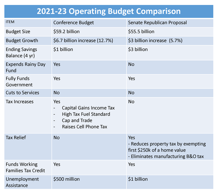 My Senate Republican colleagues and I offered what I think is a better path forward and attempted to amend the budget. Our proposal spent $4 billion less, maintained healthy reserves, and imposed no new taxes, while still funding critical government services. It also made significant investments in other areas, including spending $1 billion on unemployment benefits to avoid crushing small businesses with higher unemployment insurance rates.