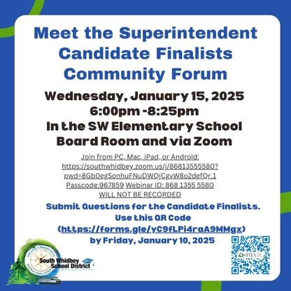 All of the school community is invited to meet the candidates in person or via Zoom at the Community Forum on Wednesday, January 15, from 6:00 to 8:25pm in the South Whidbey Elementary School Board Room, 5380 Maxwelton Road, Langley or via Zoom webinar. Passcode: 967859 Webinar ID: 868 1355 5580