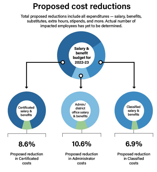 The proposal is to reduce spending from the budget among Certificated staff by approximately 8.6%, among Classified staff by approximately 6.9%, and among Administrators/district office staff by approximately 10.6%. Non-salary costs are proposed to be reduced by approximately 16%.