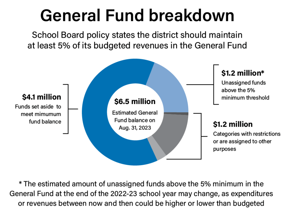 That is estimated to leave the General Fund near the School Board-required minimum level — not enough to cover the projected budget deficit in the next school year.