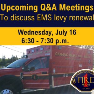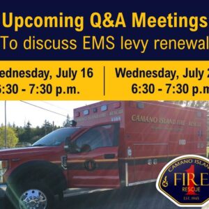 CAMANO ISLAND FIRE & RESCUE DISTRICT: Camano Island Fire & Rescue will ask voters to consider renewing its emergency medical services (EMS) levy during the Aug. 5 primary election. To help residents learn more, the district will host two public Q&A sessions in July.