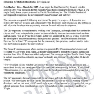 WHIDBEY NEWS-TIMES: The Oak Harbor City Council granted a developer a two-year extension of an agreement related to a large-scale housing development on the hillside above the Safeway and Walmart.