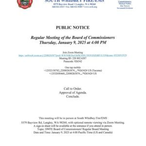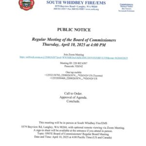 SOUTH WHIDBEY FIRE/EMS: Public Notice: Regular Meeting of the Board of Commissioners Thursday, July 10, 2025 at 4:00 PM.