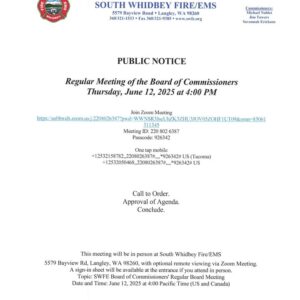SOUTH WHIDBEY FIRE/EMS posted public notice for their Thu., June 12, 2025 board meeting, including the link for the Zoom meeting.
