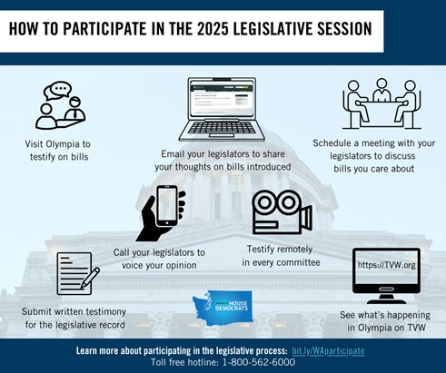 The 2025 session has begun, and our democracy is strongest when everyone can participate! We’ve made it easier to learn about proposed legislation, watch debates on important issues, and testify in person or remotely. Whether you are back home in district or traveling down to Olympia, consider making your voice heard this year.
