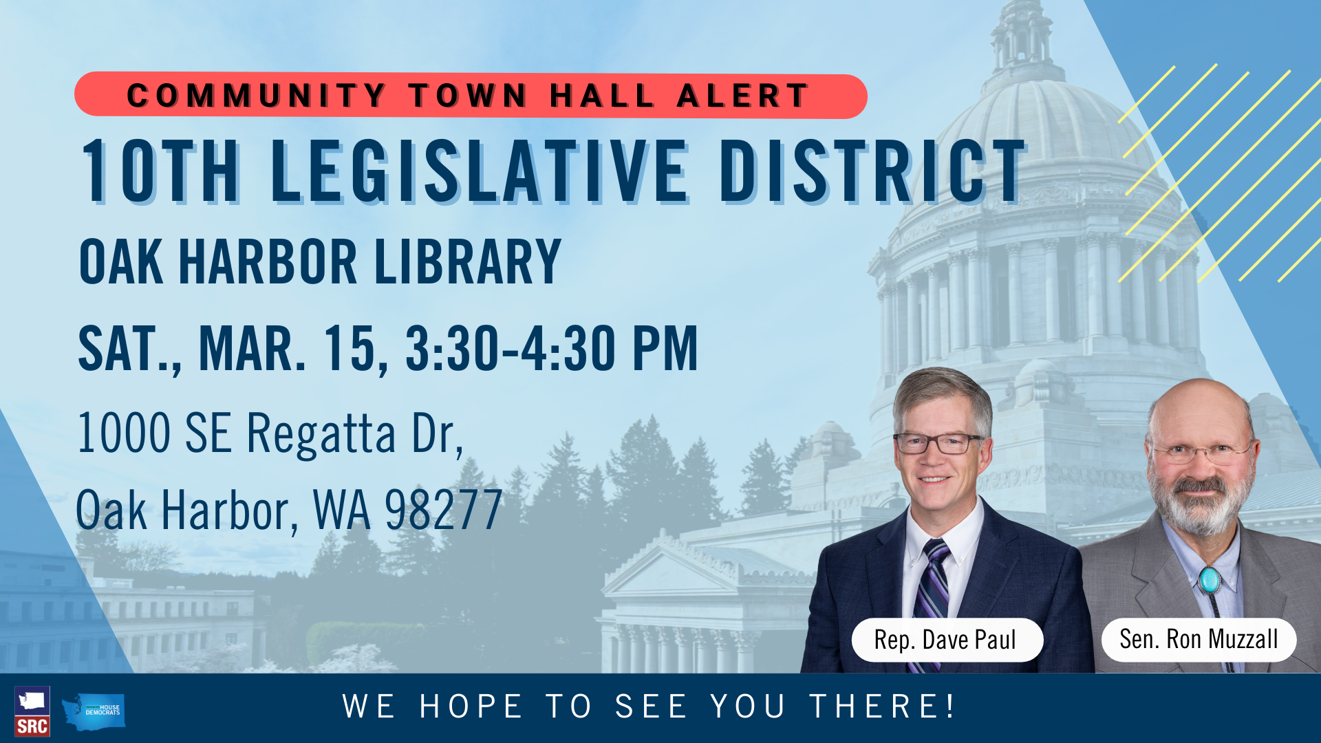 Town hall meetings are a long tradition in our American democracy—and in the 10th District. I am excited to extend an invitation to our upcoming bipartisan town hall in Oak Harbor on March 15th. I’ll have more forums throughout the district later in session.