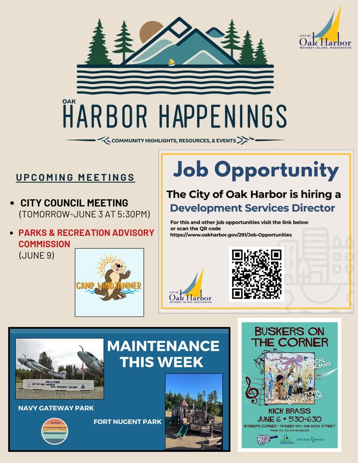 1. The City is hiring a Development Services Director. For details and to apply, click here https://www.governmentjobs.com/careers/oakharbor