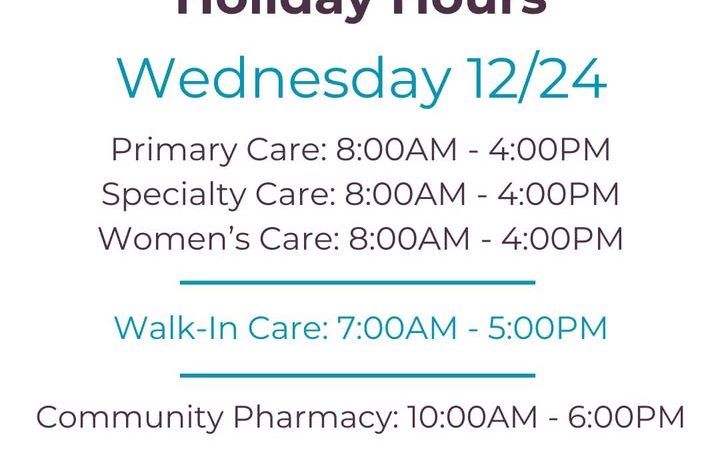 WhidbeyHealth Primary Care, Specialty Care, Women’s Care and Walk-In Care will have adjusted hours of operation on December 24 in observance of the holiday.